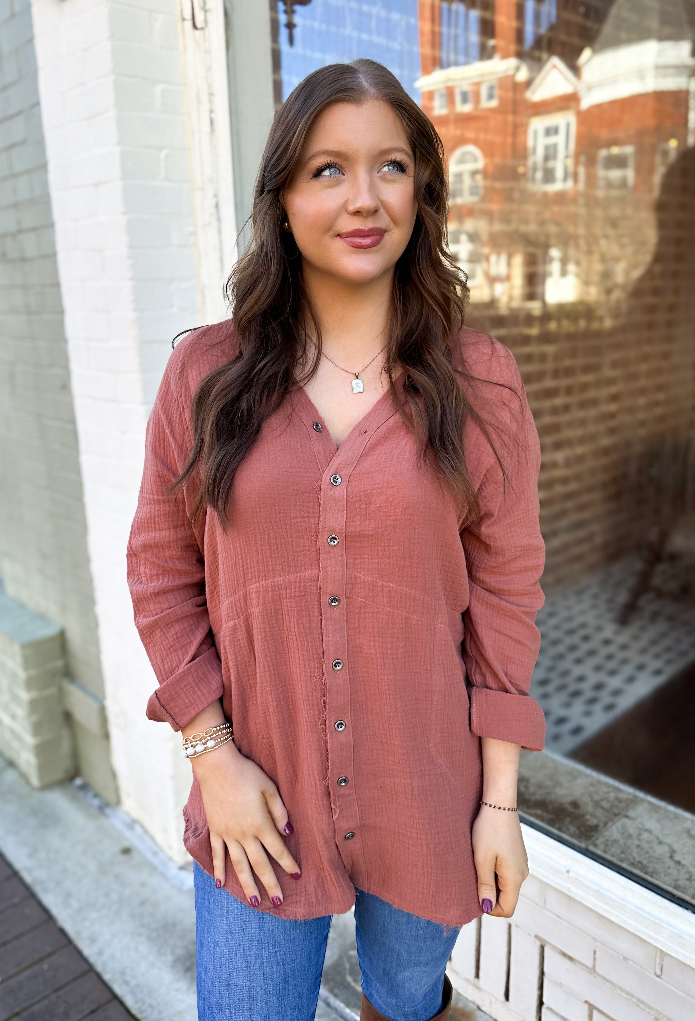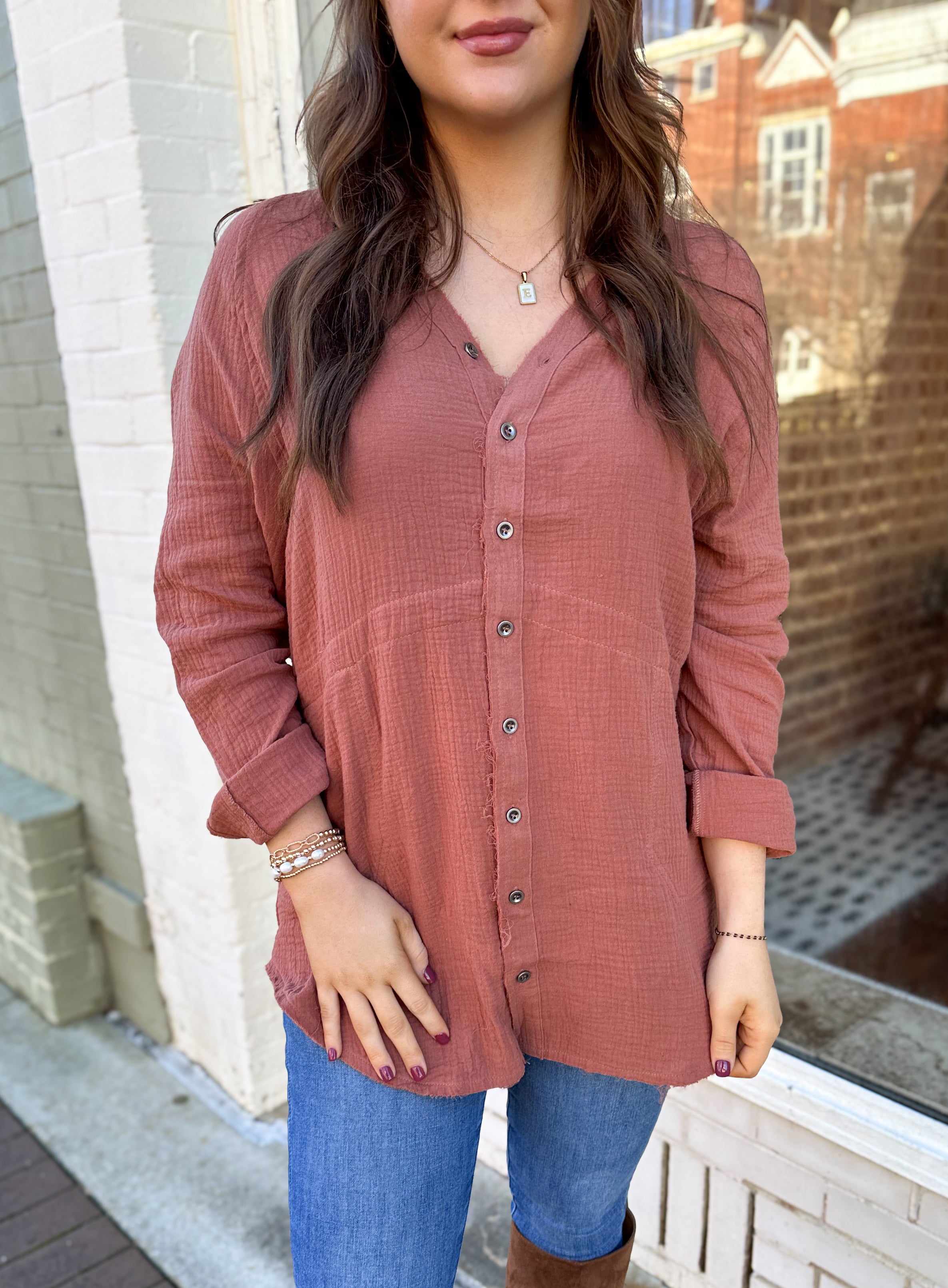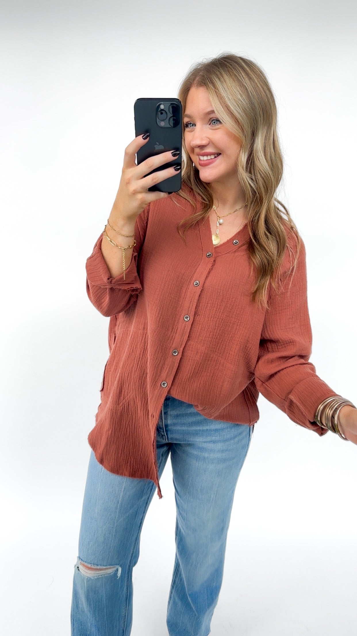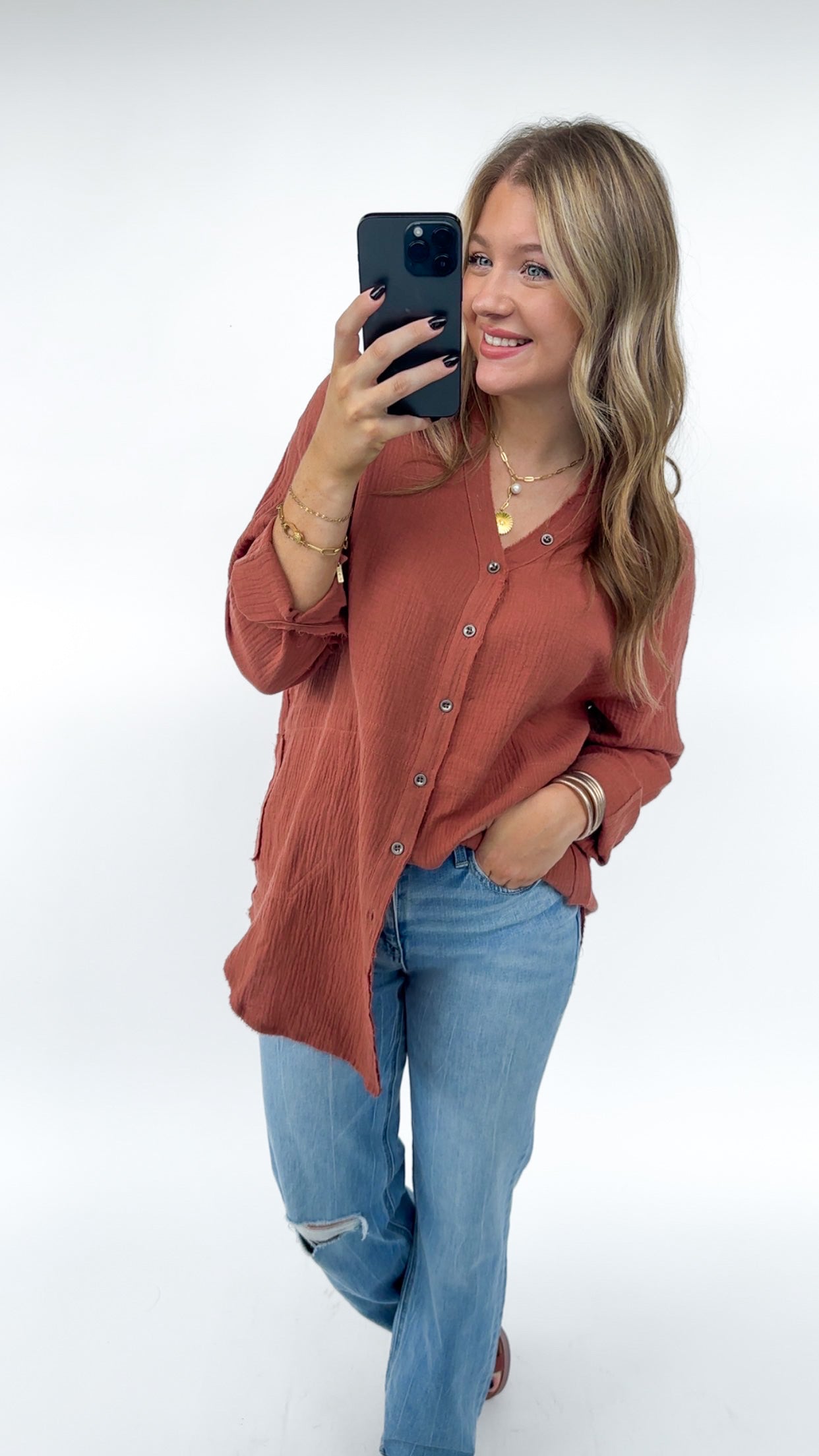This essential button down will be your everyday favorite. It features an oversized fit, soft textured fabric, side pocket details and so much more.