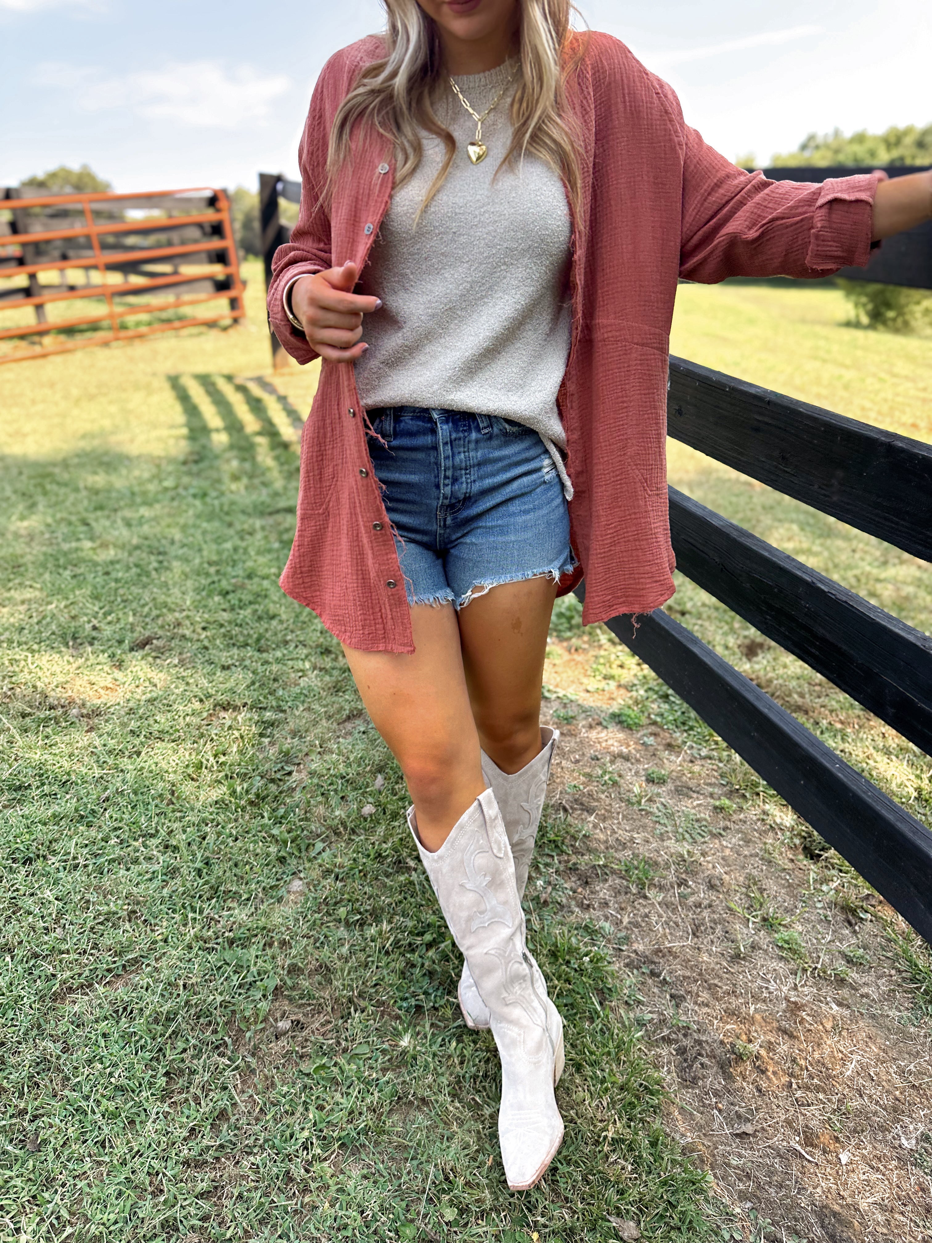 You can style this top buttoned down with a cute pair of denim or opened over a graphic tee!