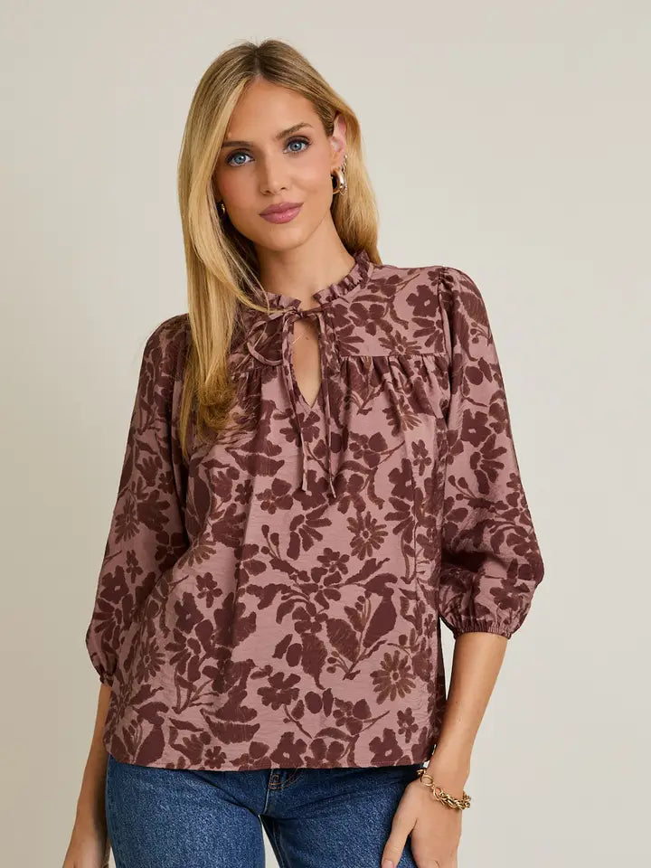Feminine and effortlessly chic, this floral tie-neck blouse features billowy 3/4 sleeves and a relaxed, flattering fit. Its rich, warm tones make it perfect for fall outings, cozy dinners, and all your upcoming seasonal events. Pair with denim or dress it up with trousers for an elegant touch.