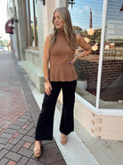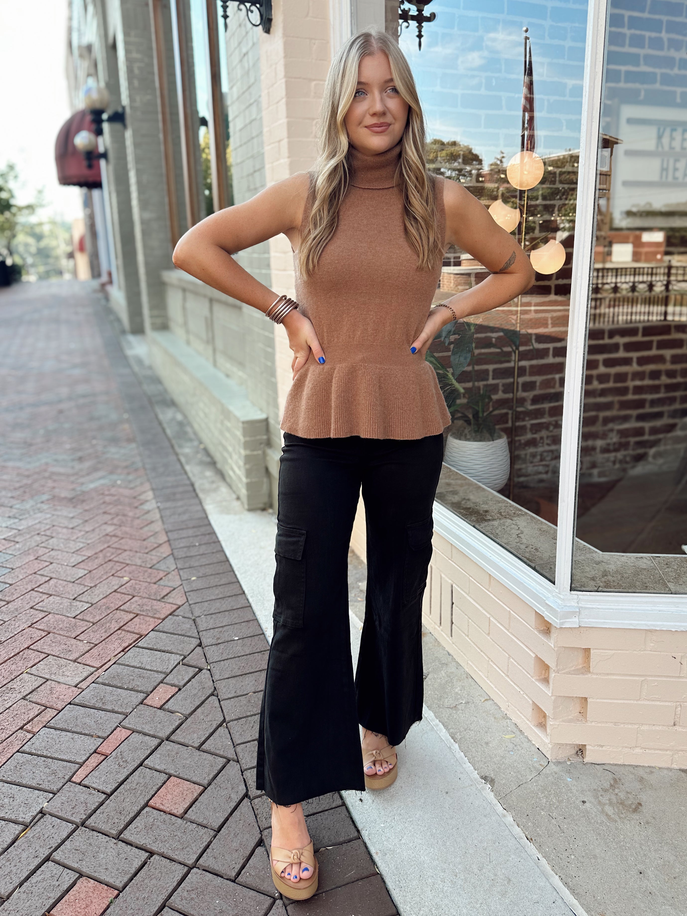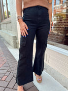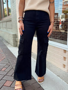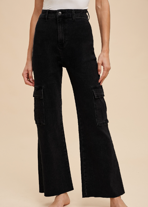 Our new cargo jeans are THE jeans this season! The stretch and comfort these provide is unmatched. They run true to size! I am pictured wearing the size small. I am 5’3 and they hit at ankle length.