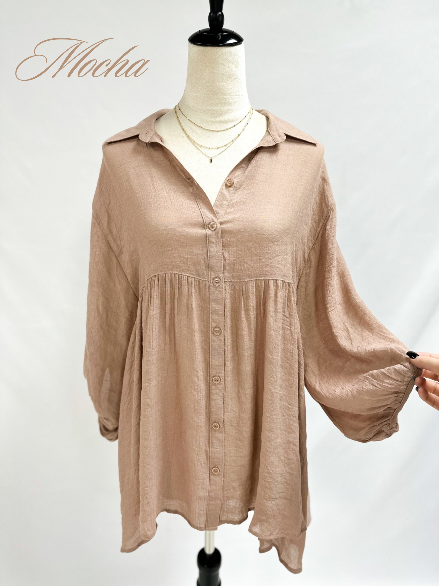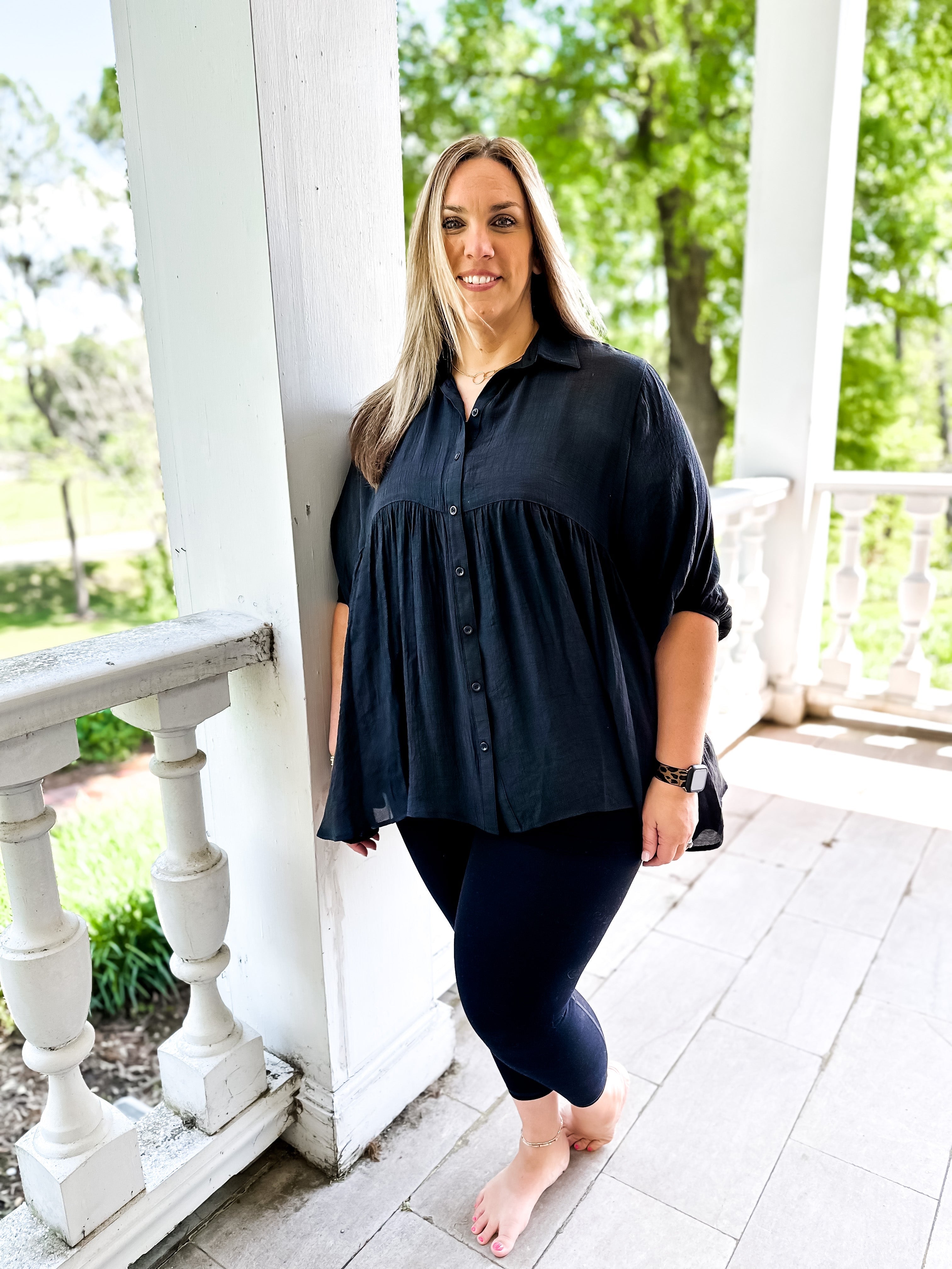 Details include: Lightweight polyester fabric, button up closure, ruffle tiered back, 3/4 sleeve, collared neckline and a high low hemline.