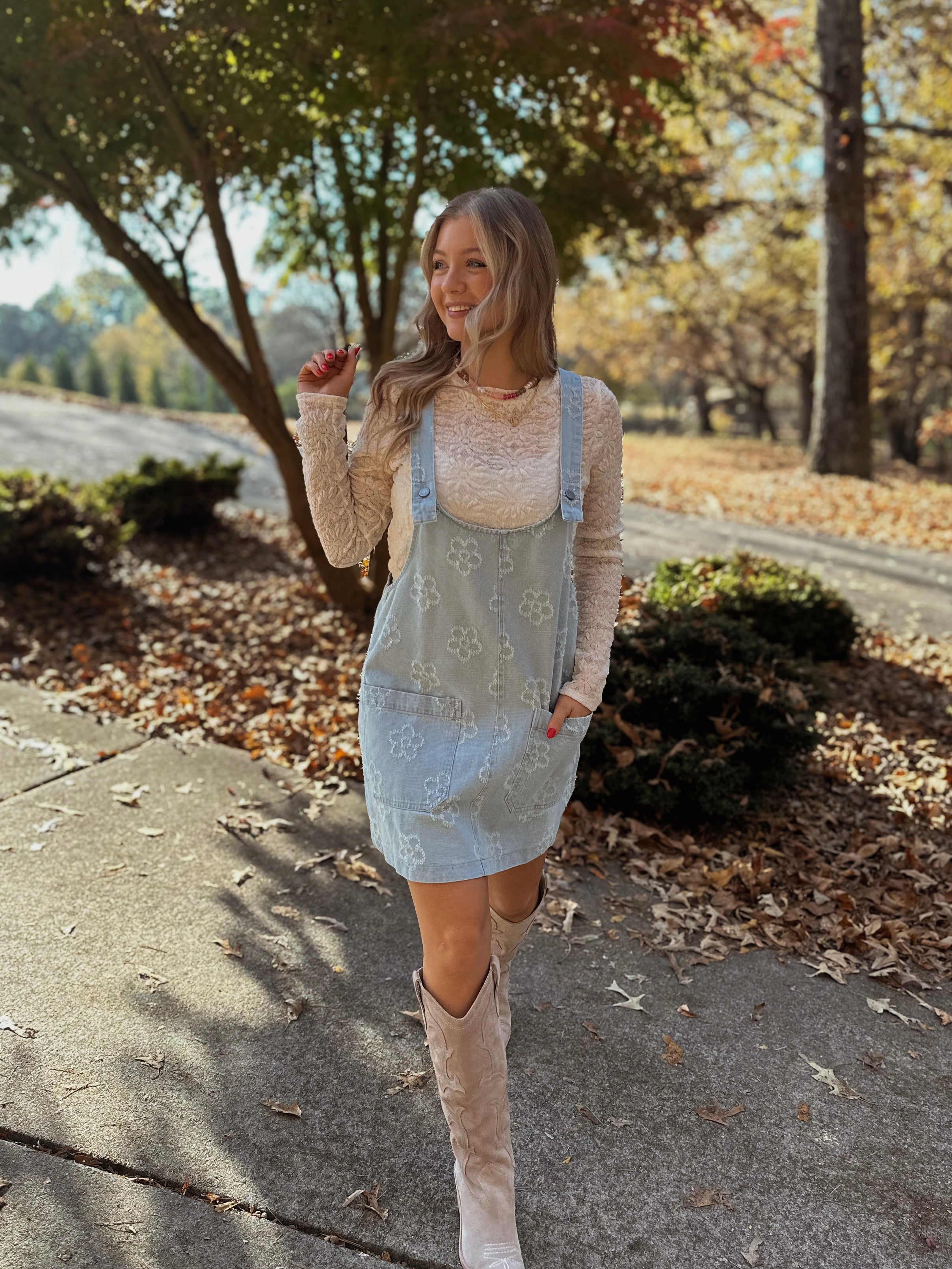 Meet your new favorite fall layer! This denim overall dress features the sweetest floral distressing and functional pockets (because we love cute and practical). Pair it with a long sleeve tee or chunky sweater and boot for the perfect seasonal look!