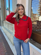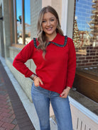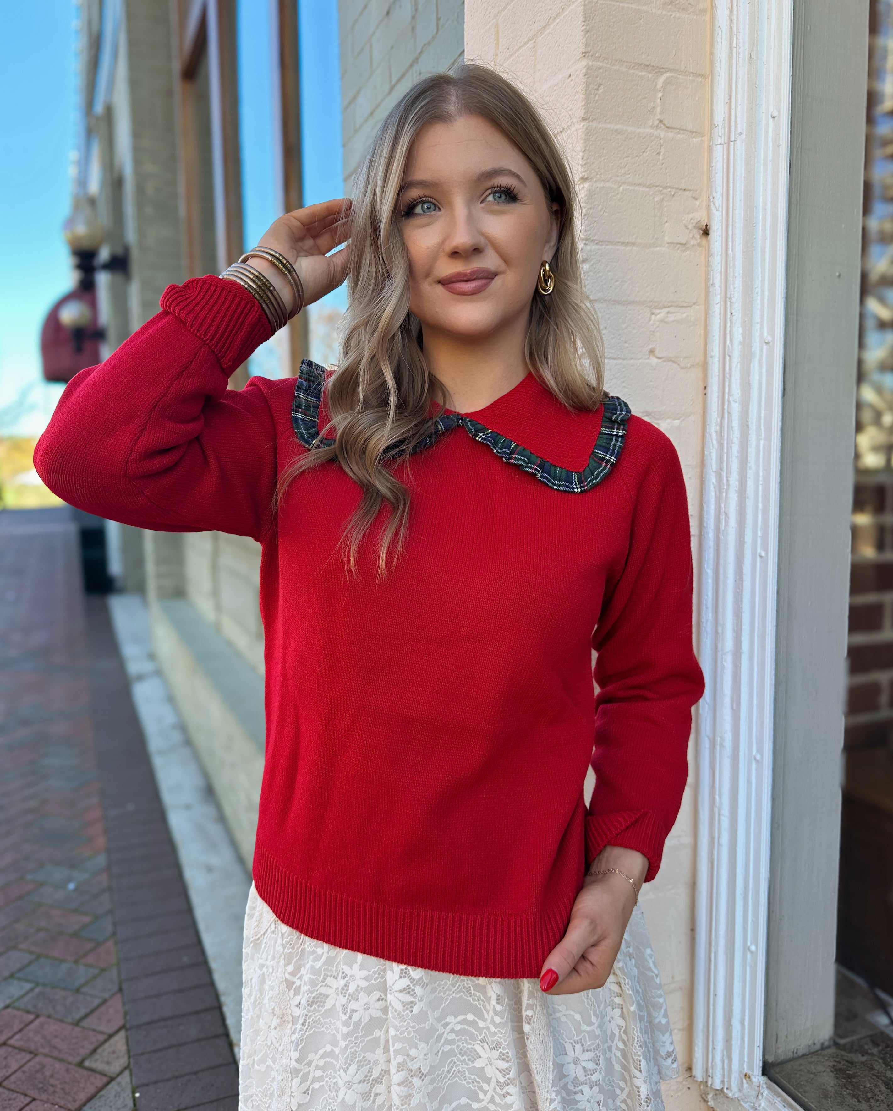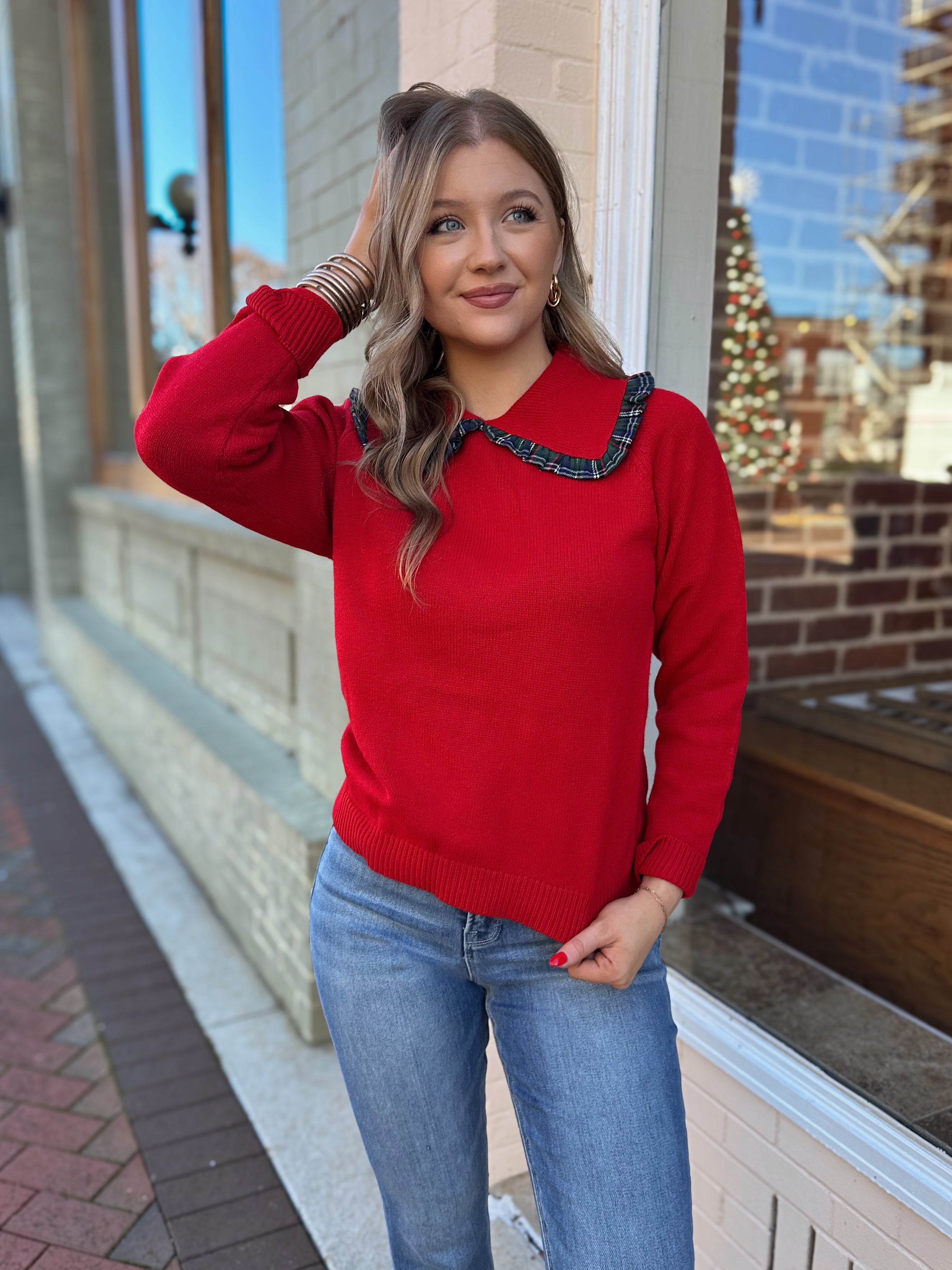 Celebrate the season in timeless holiday style with our 'Dreaming Of A Plaid Christmas Sweater'. This charming red knit features a standout plaid-trimmed collar that adds a playful, vintage-inspired touch. Soft, cozy, and effortlessly festive, it pairs perfectly with your favorite skirts or denim for a classic Christmas look. Whether you’re trimming the tree, attending a holiday gathering, or sipping cocoa fireside, this sweater brings cheerful charm to every moment.