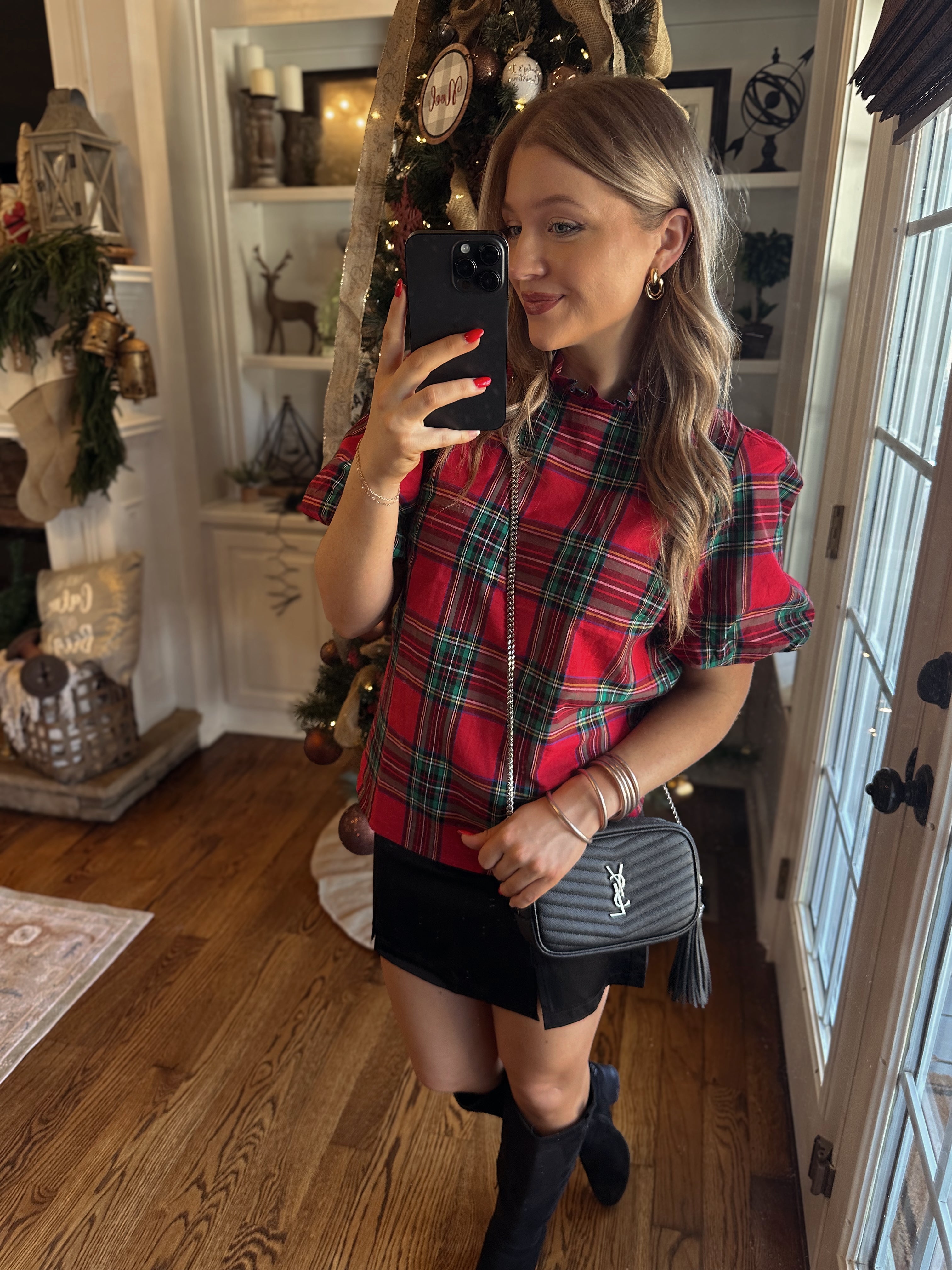 Holiday Plaid Puff Sleeve Blouse