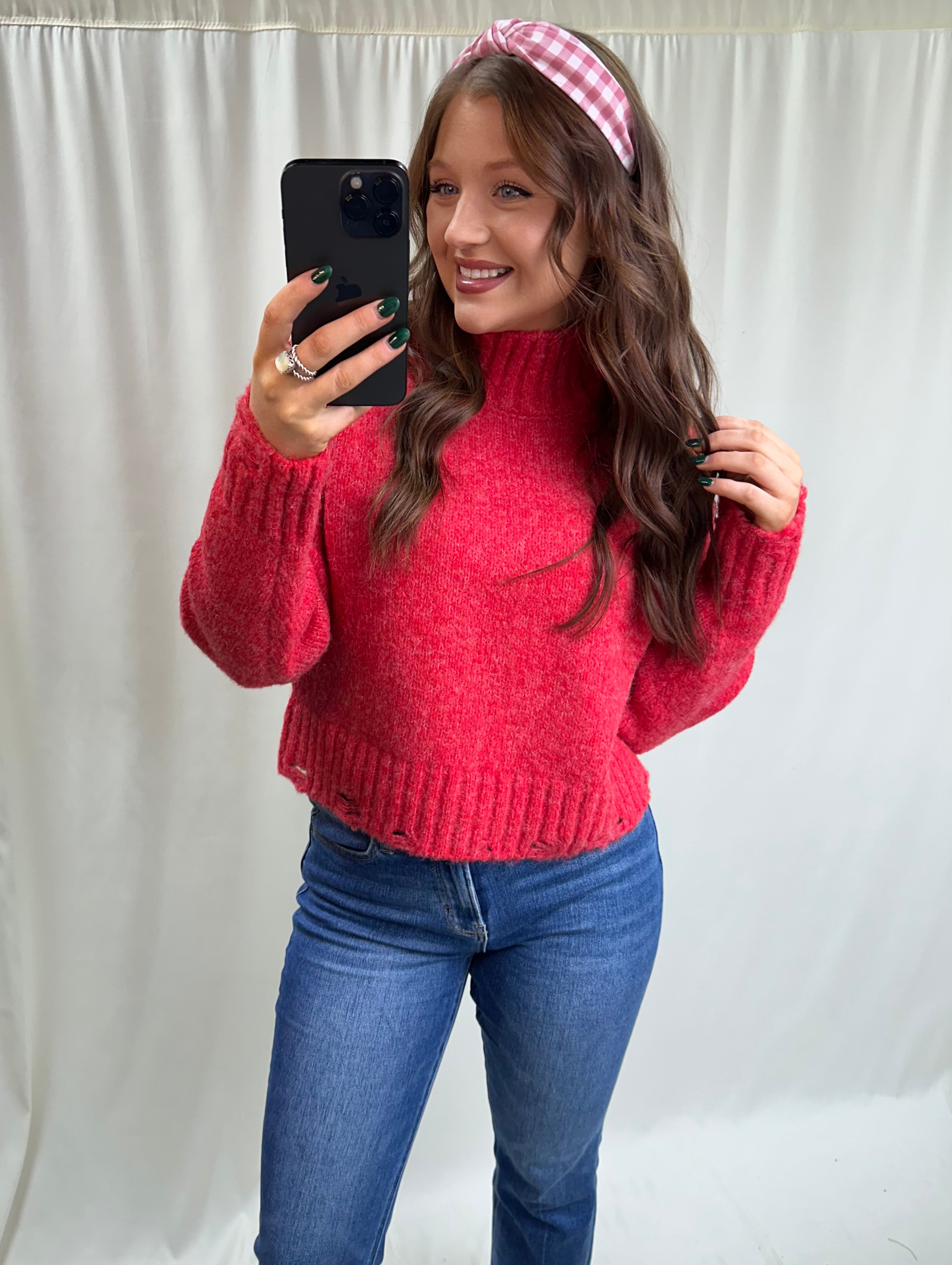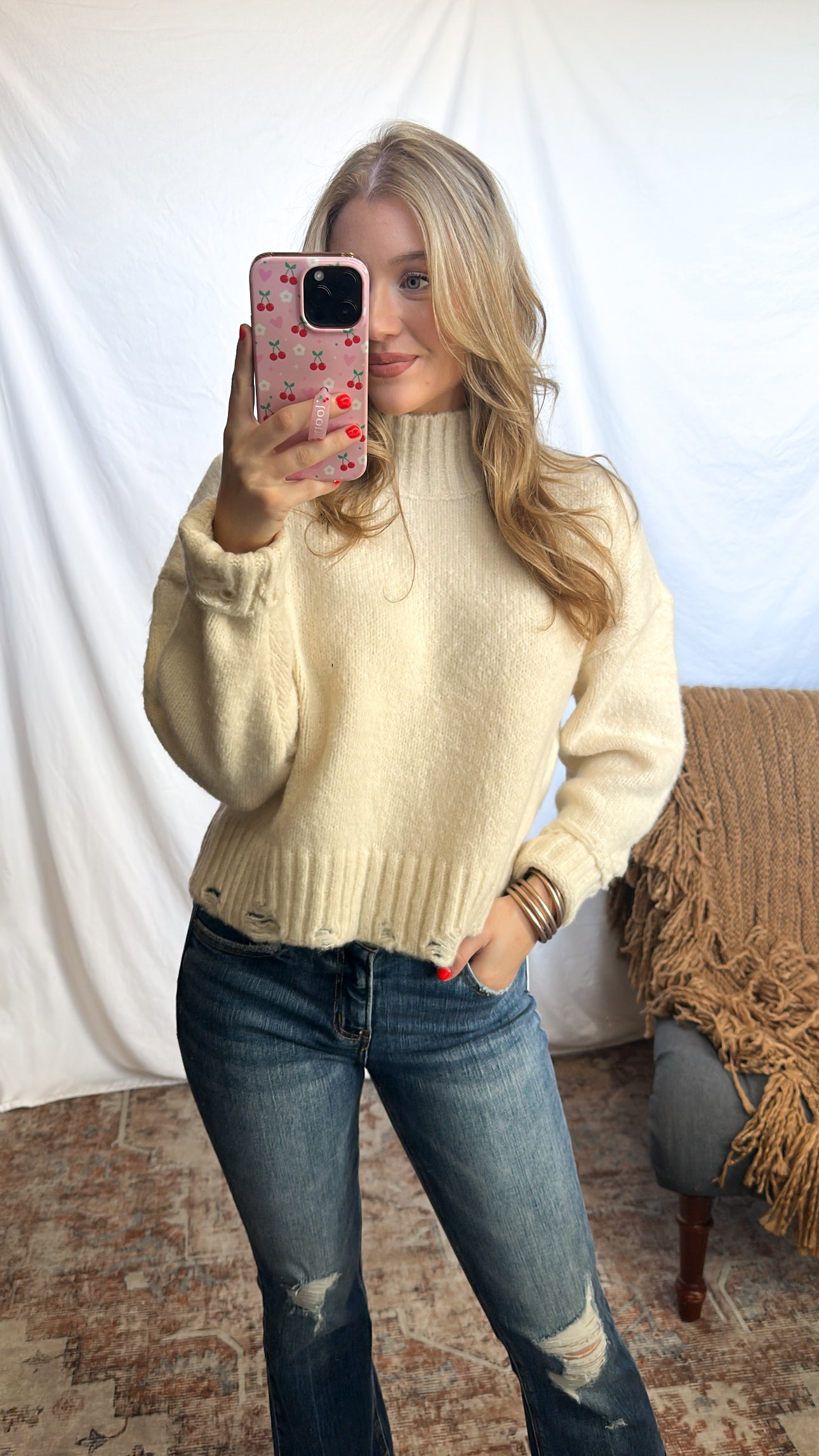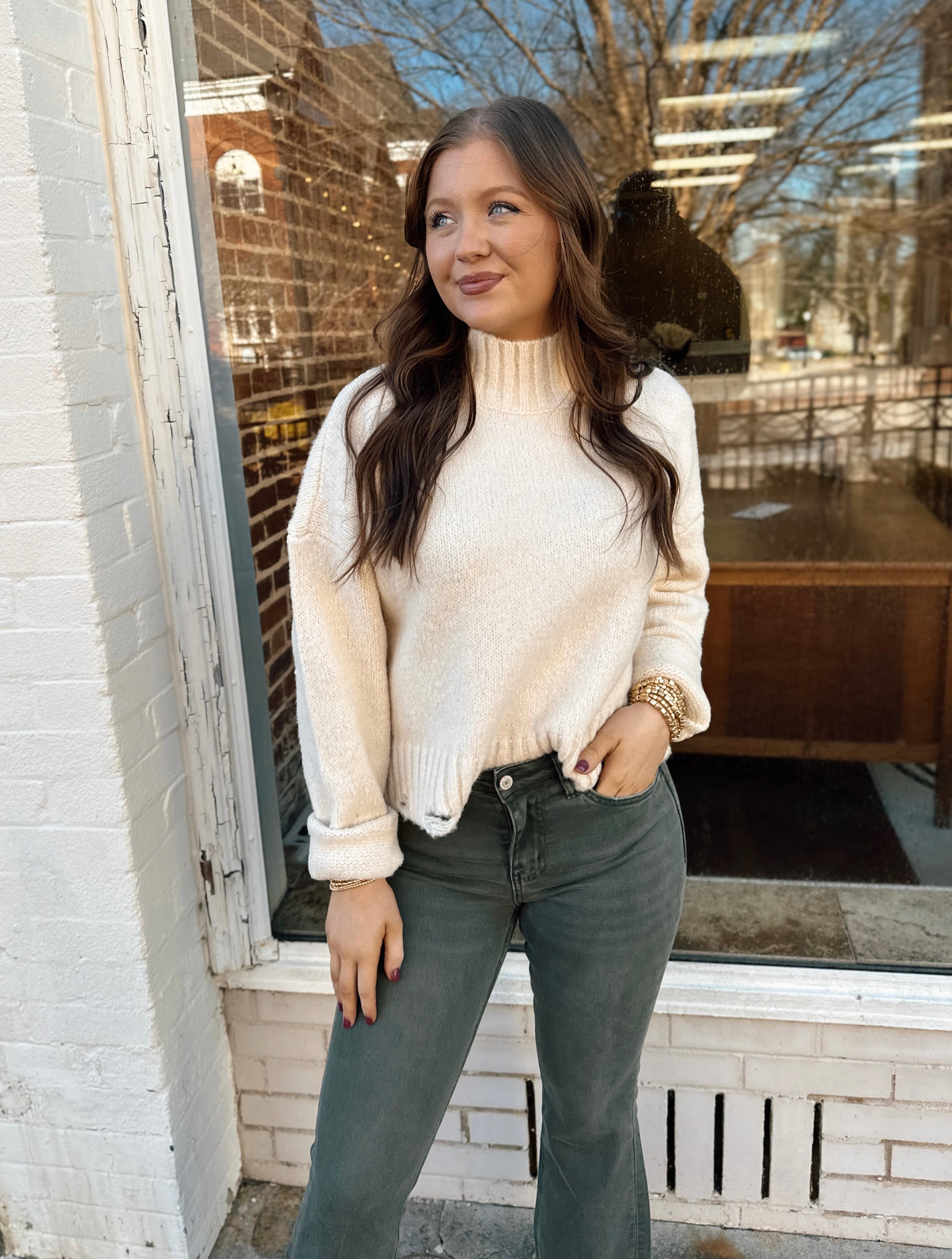 - Mock Neck Solid Cozy Sweater Top - Distressed Ribbed Hem Detail - Long Sleeve - Dropped Shoulder
