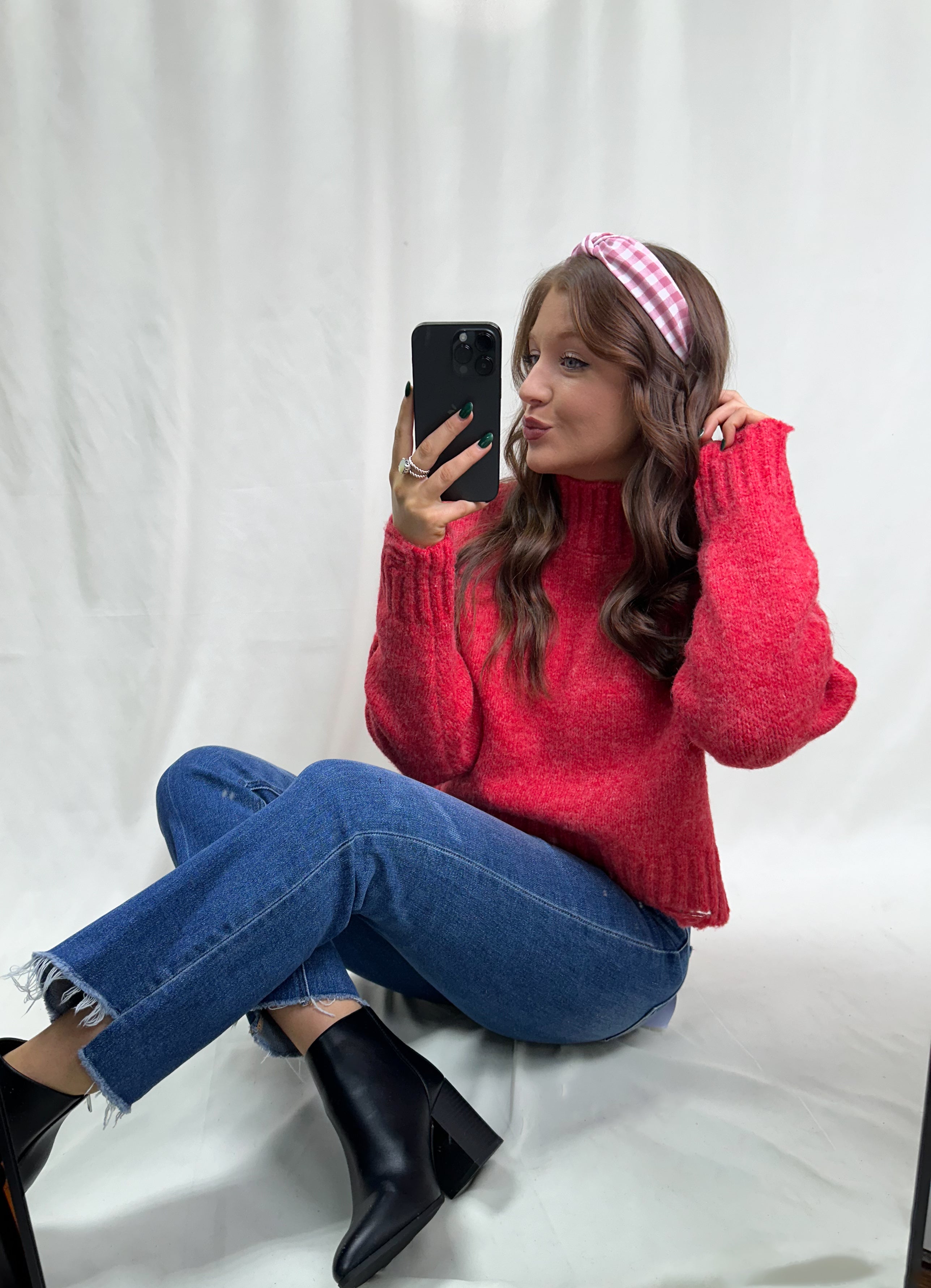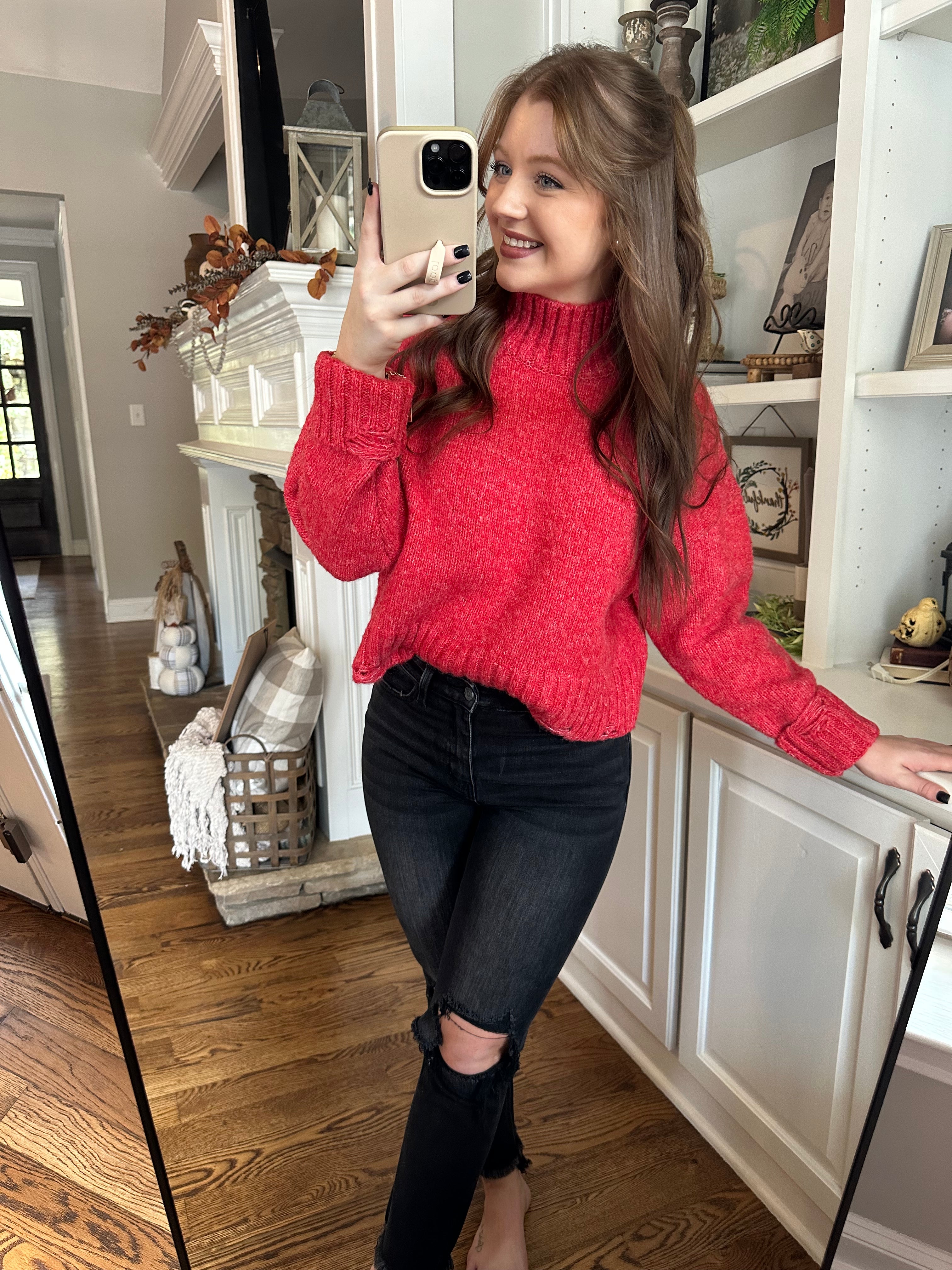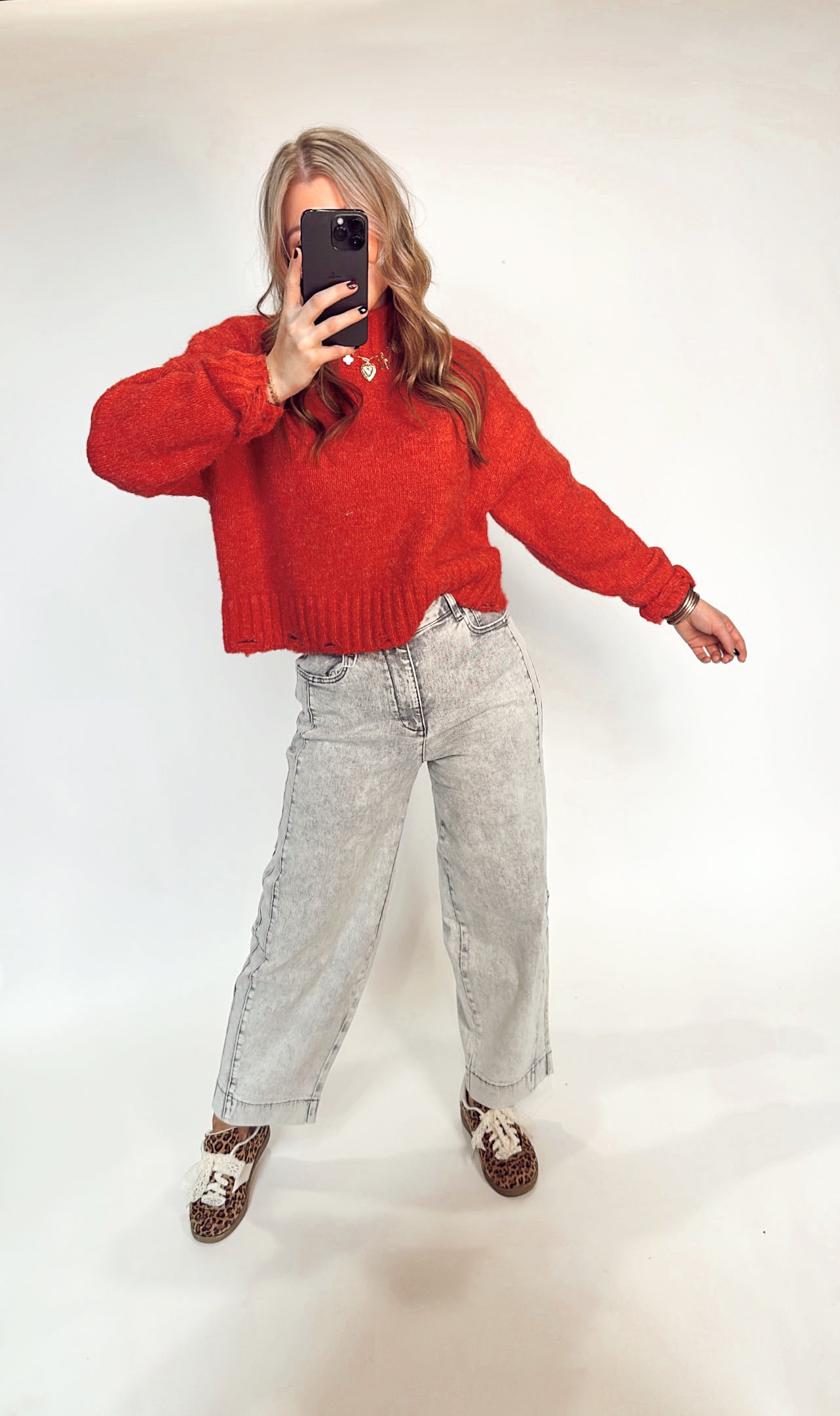 - Mock Neck Solid Cozy Sweater Top - Distressed Ribbed Hem Detail - Long Sleeve - Dropped Shoulder