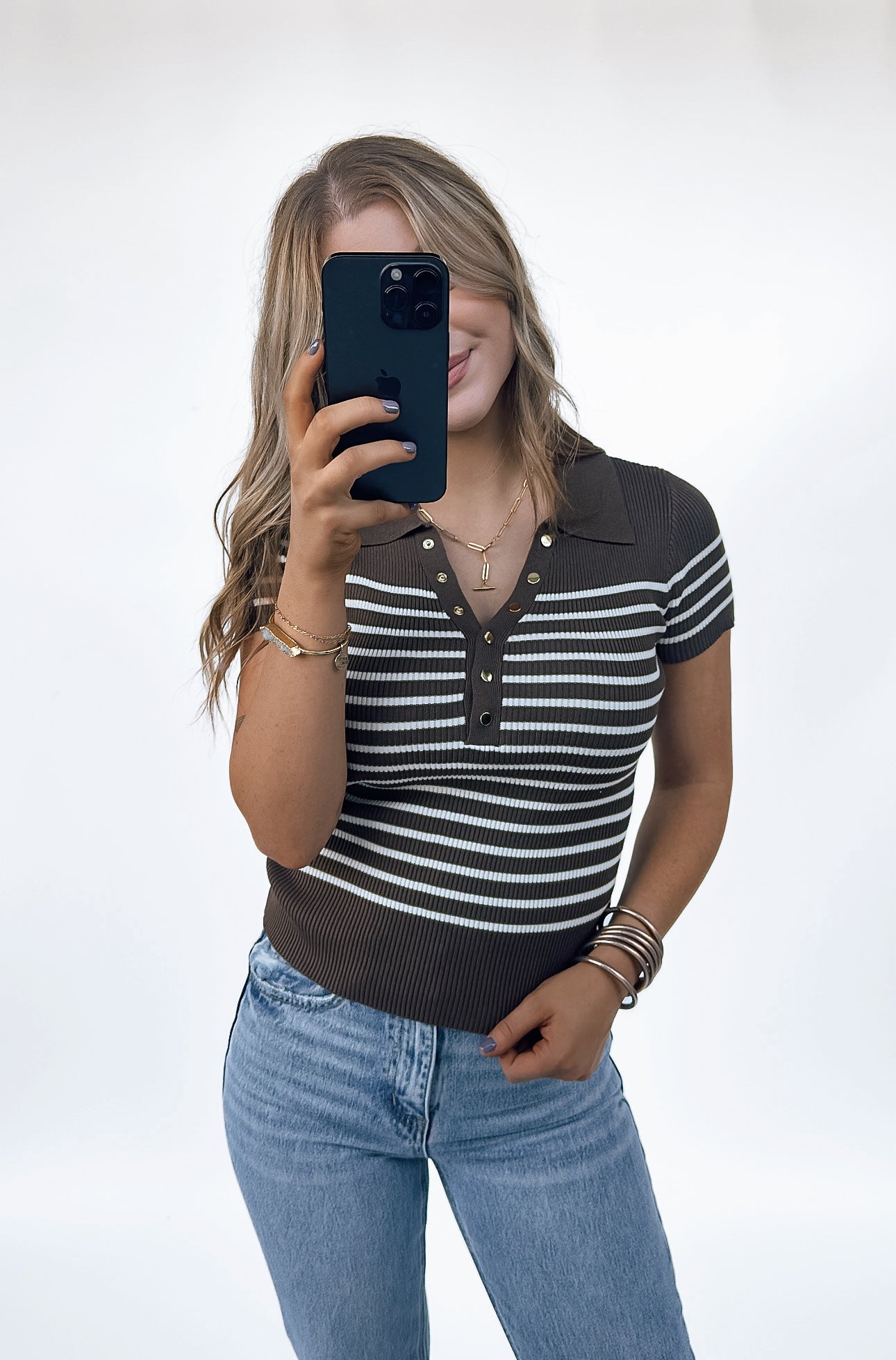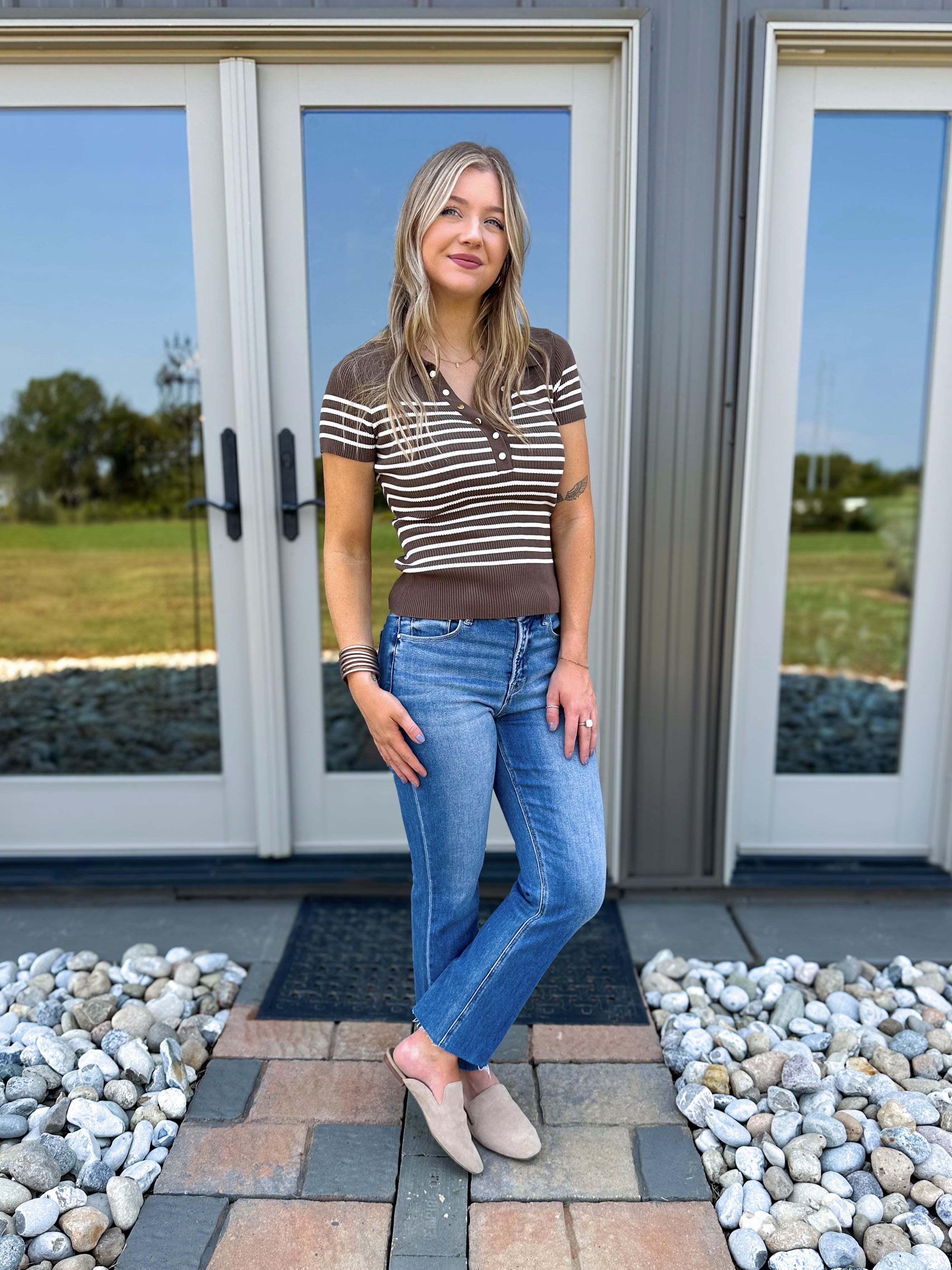 A knit top that brings you style and comfort! The soft knit material is elevated with gold button accents down the front that give you a chic feel! Pair with shorts, tuck into a skirt, or wear under a cardigan, blazer, or shacket! The ease of styling makes this perfect for everyday wear and can be worn all year round!