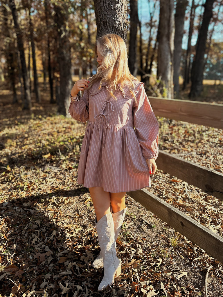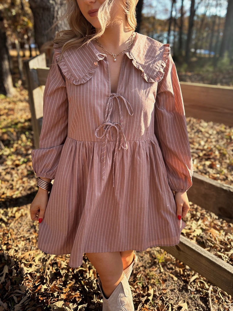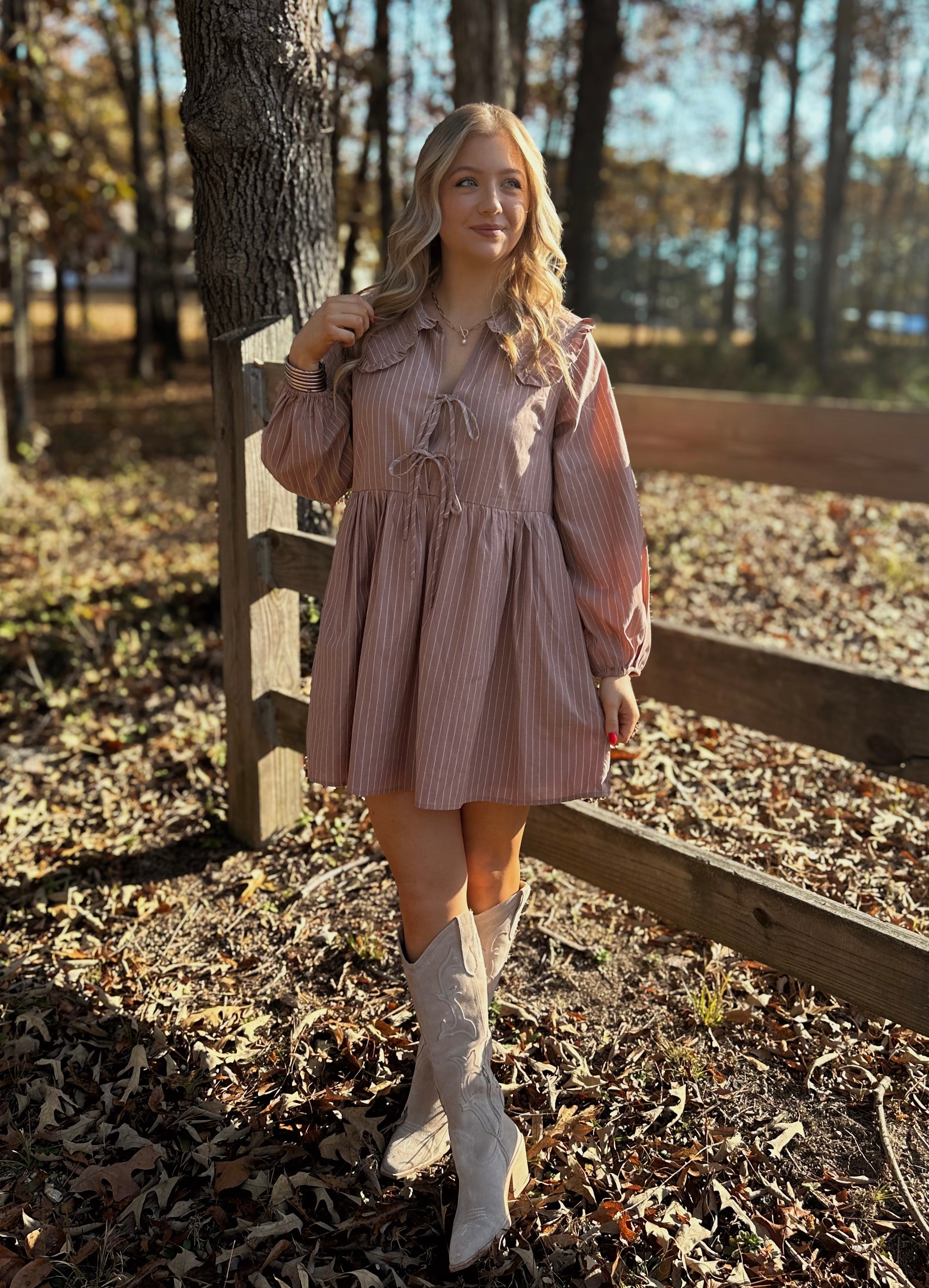 A dreamy neutral stripe dress made for all your holiday moments! The soft color palette makes it perfect for both Thanksgiving gathering and Christmas celebrations. From the Peter Pan collar to the front ties, this dress is all things beautiful and feminine!