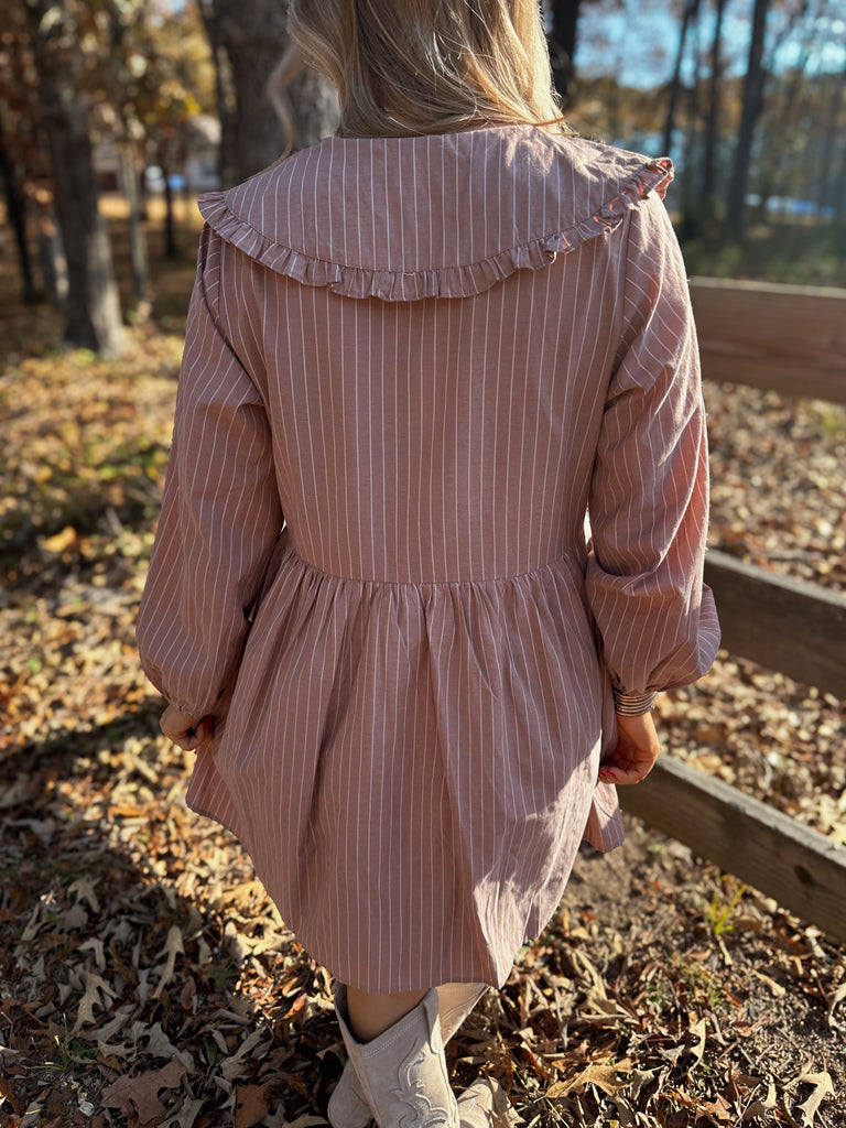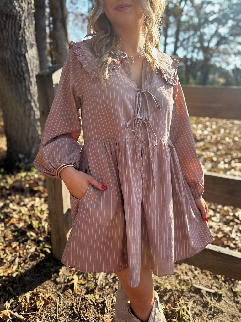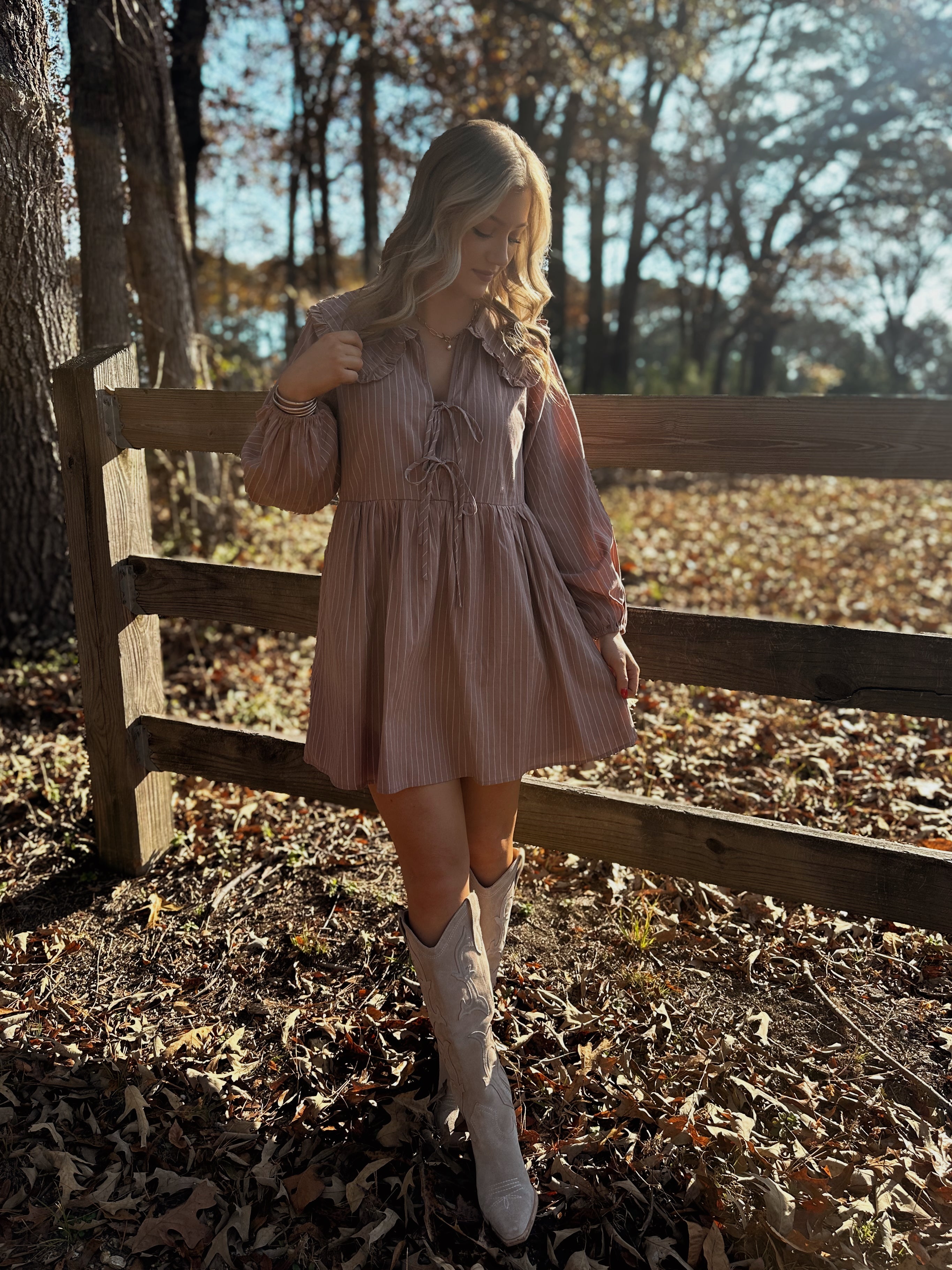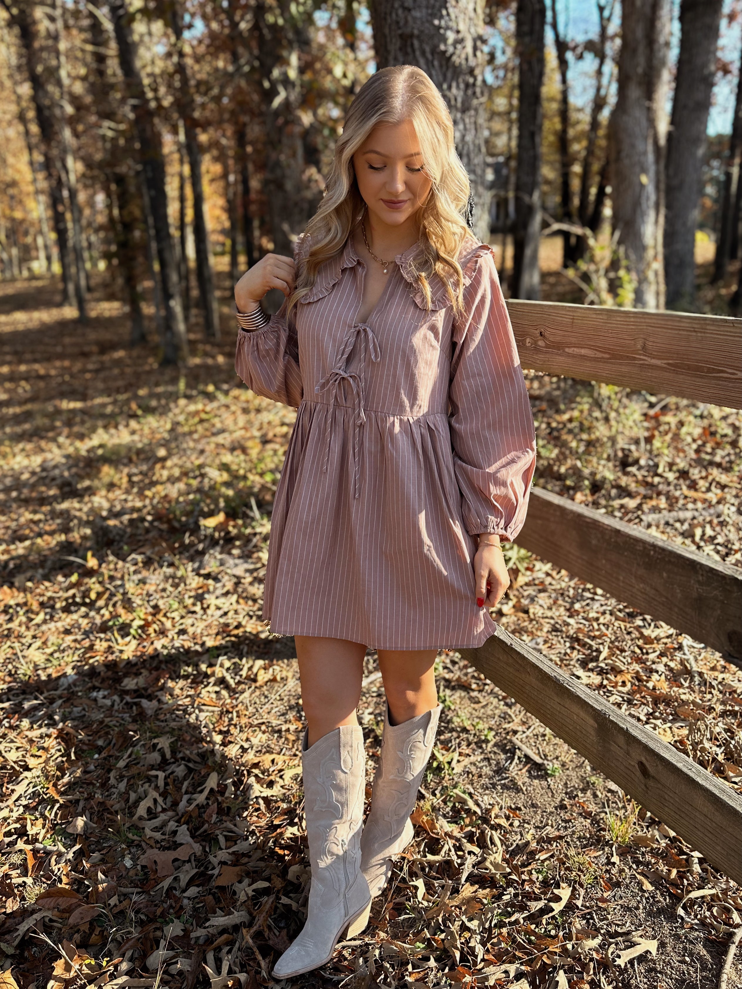 A dreamy neutral stripe dress made for all your holiday moments! The soft color palette makes it perfect for both Thanksgiving gathering and Christmas celebrations. From the Peter Pan collar to the front ties, this dress is all things beautiful and feminine!