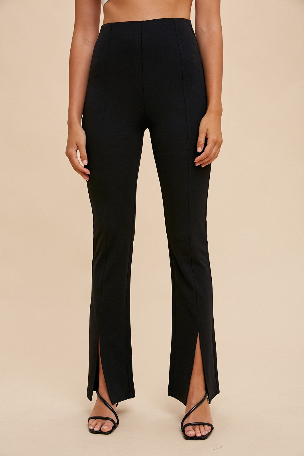 - High Rise Waist - Comfort Stretch - Pin-tuck Details - Front Slits - Flared Skinny Fit - 95% Polyester 5% Spandex