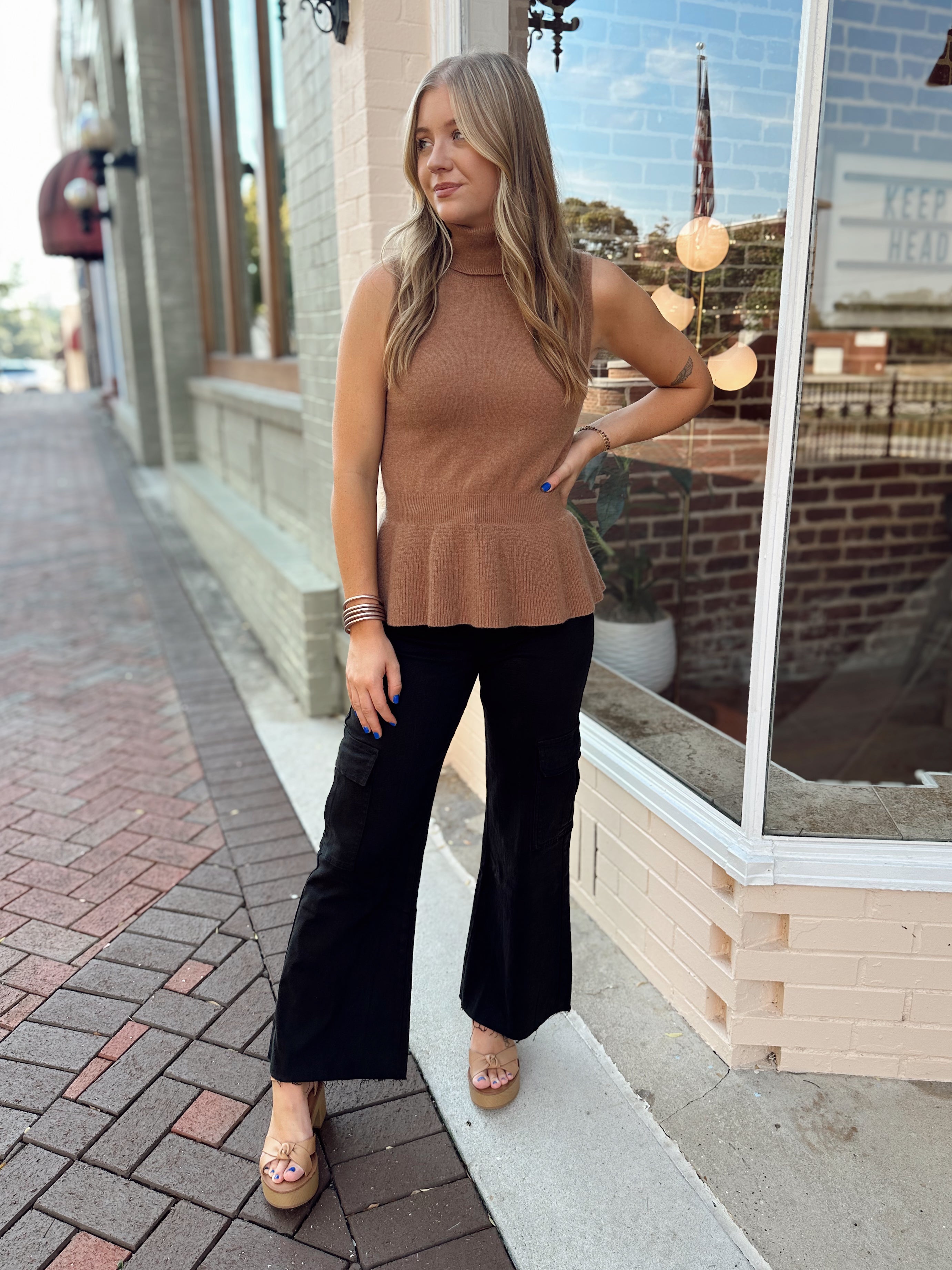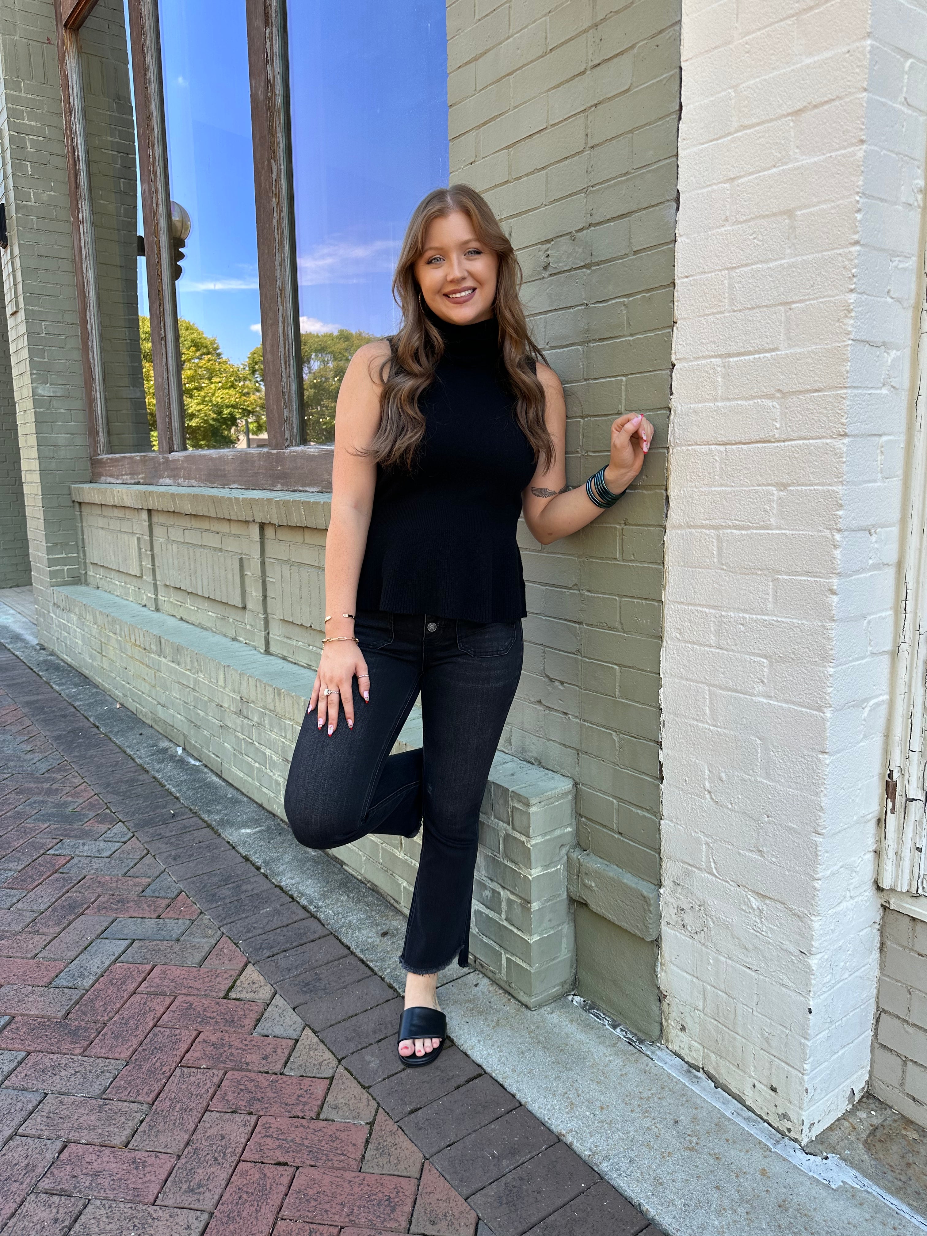 This turtle neck sweater tank features a peplum waist that is extremely flattering. It holds you in all the right places. It is 90% Wool and 10% Cashmere... talk about comfort!!