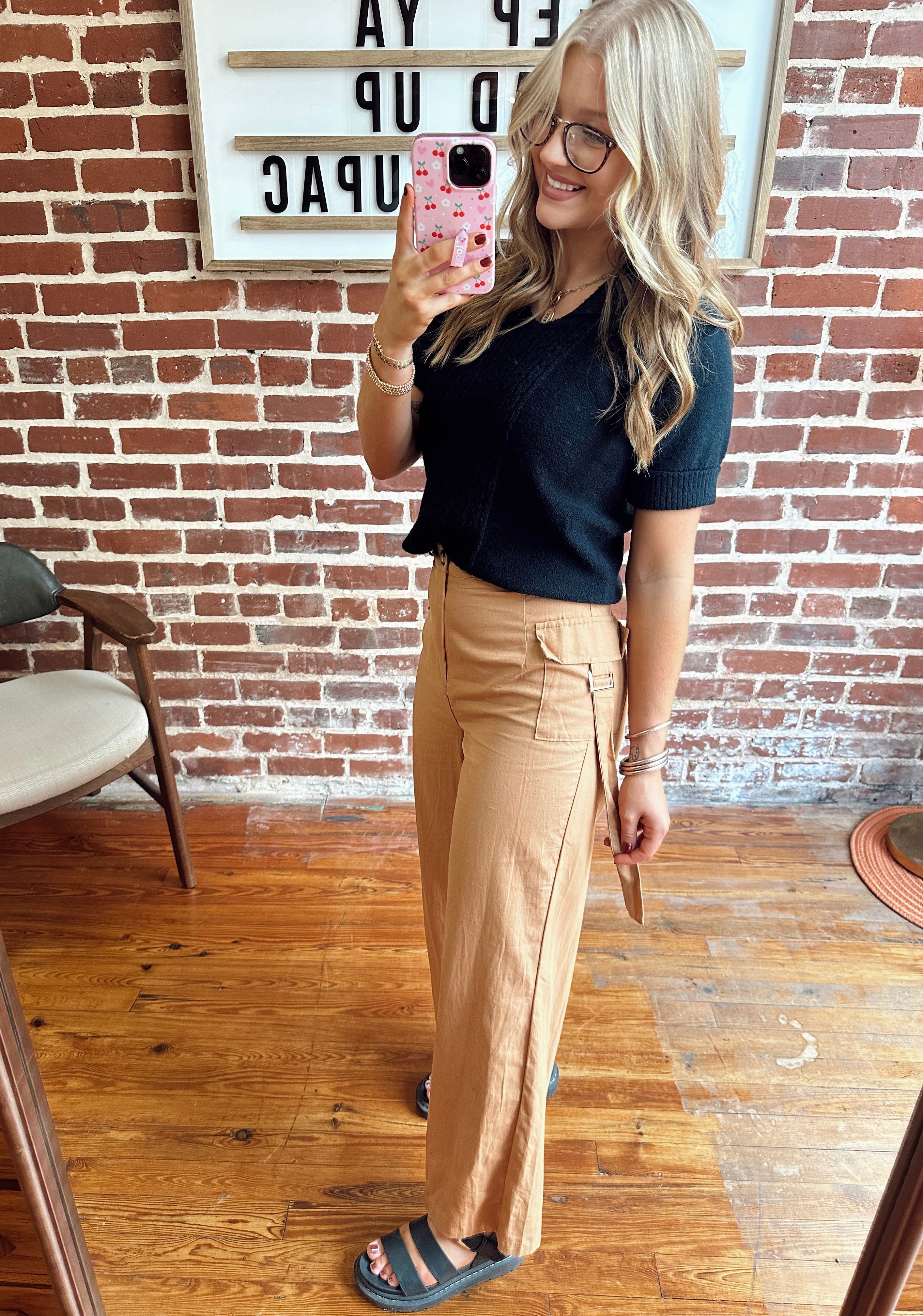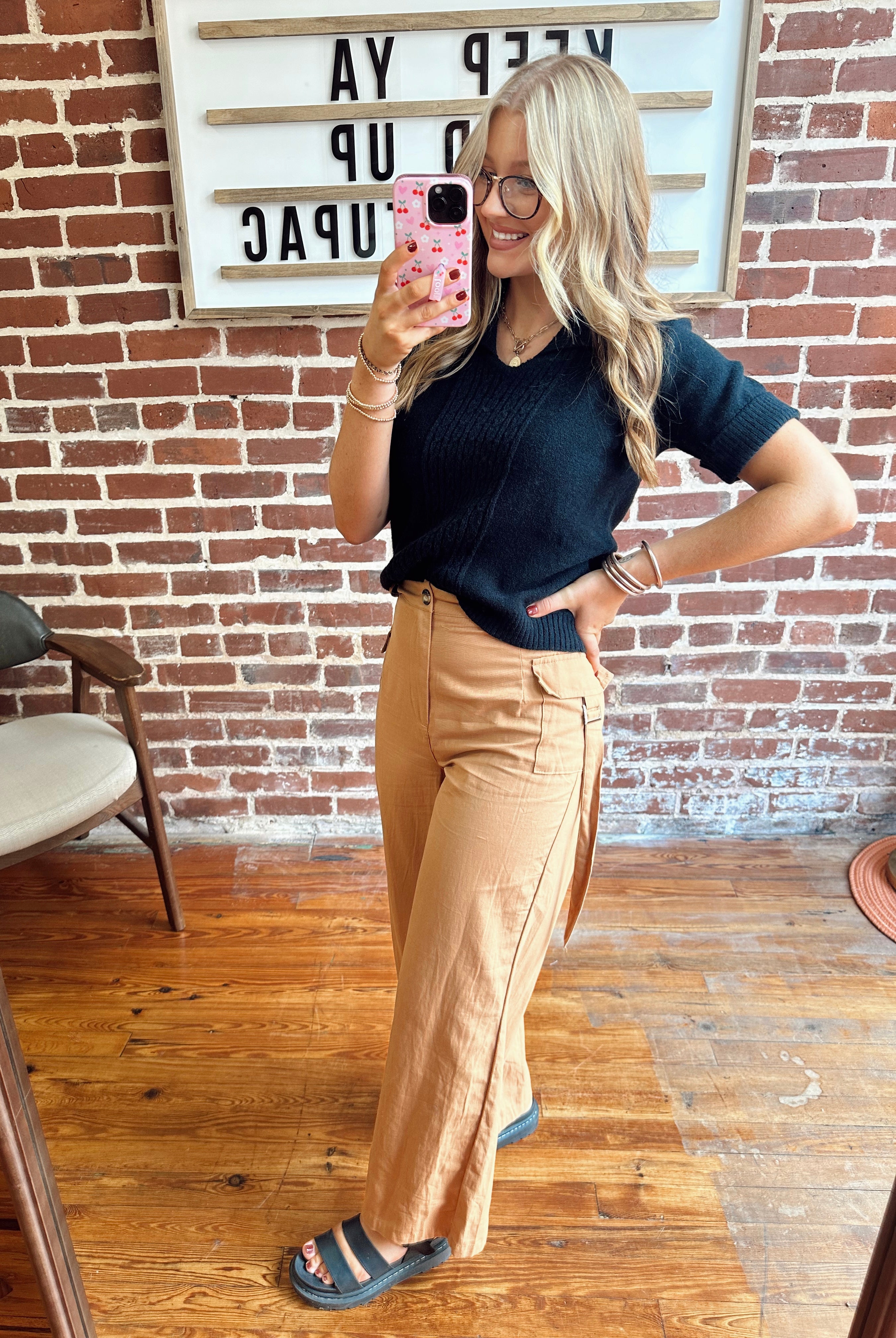 Our new Trend Setter Cargo Pants are designed with a high-waisted fit, belt loops, and cargo inspired pockets with the long strings attached for an on-trend style.