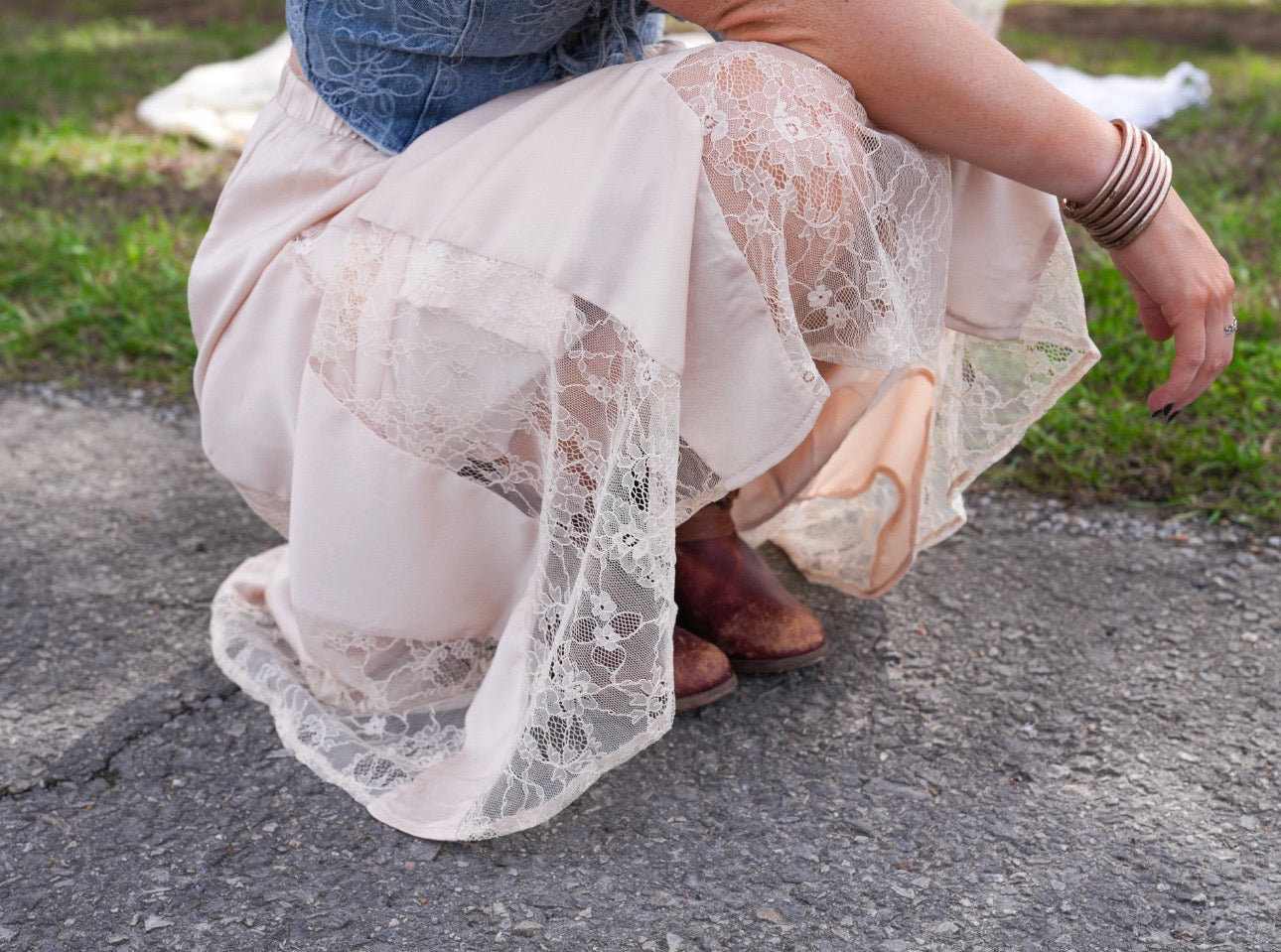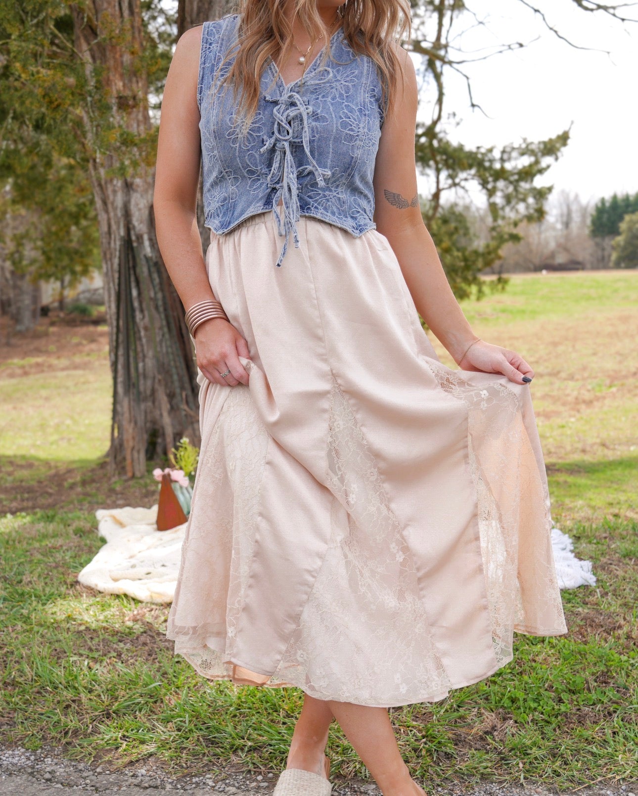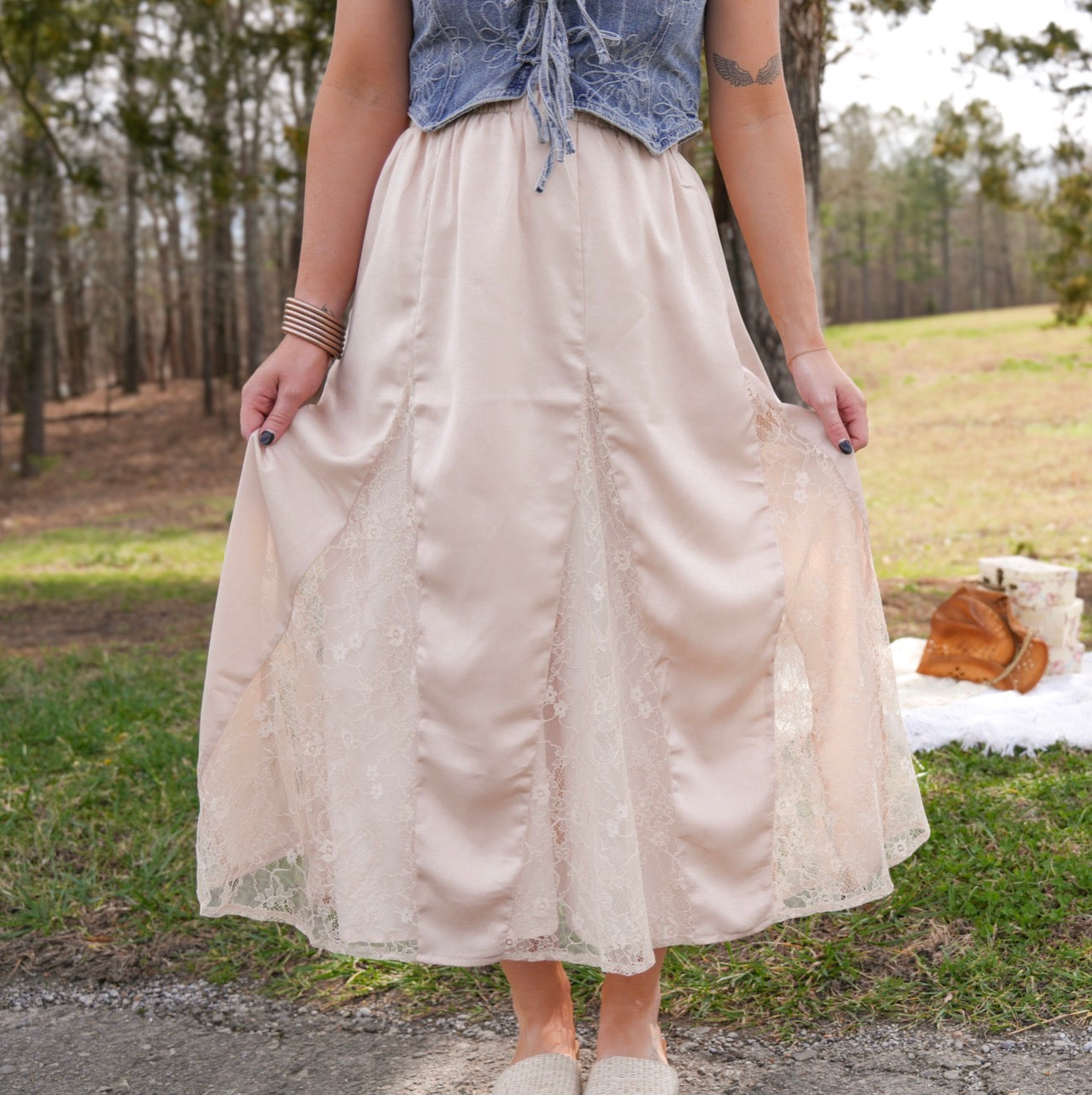 Our new "Whimsical Lace Satin Skirt" is a must-have! Dress up any casual outfit with this beautiful skirt. I mean... the skirt IS the whole moment!
